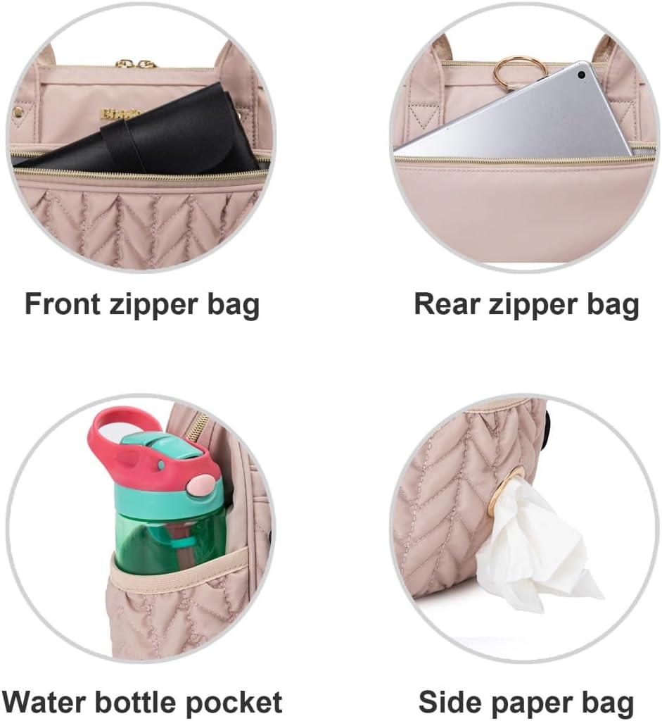 - Durable Crossbody Diaper Bag : Featuring a fashionable quilted design, made of durable water-resistant polyester fabric, strong zippers, reinforced stitches, and easy-to-clean lining.