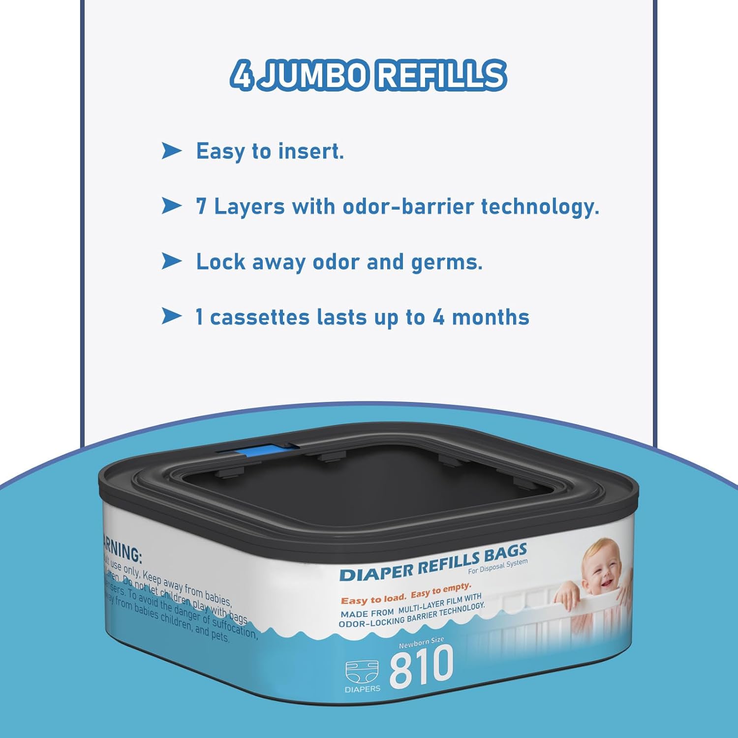 Jumbo Square Refills Disposal Bags Refill Compatible with Diaper Genie Classic, Compact and Select Pails, Hold Up to 810 Newborn-Sized Diapers Per Refill, 4 Packs
