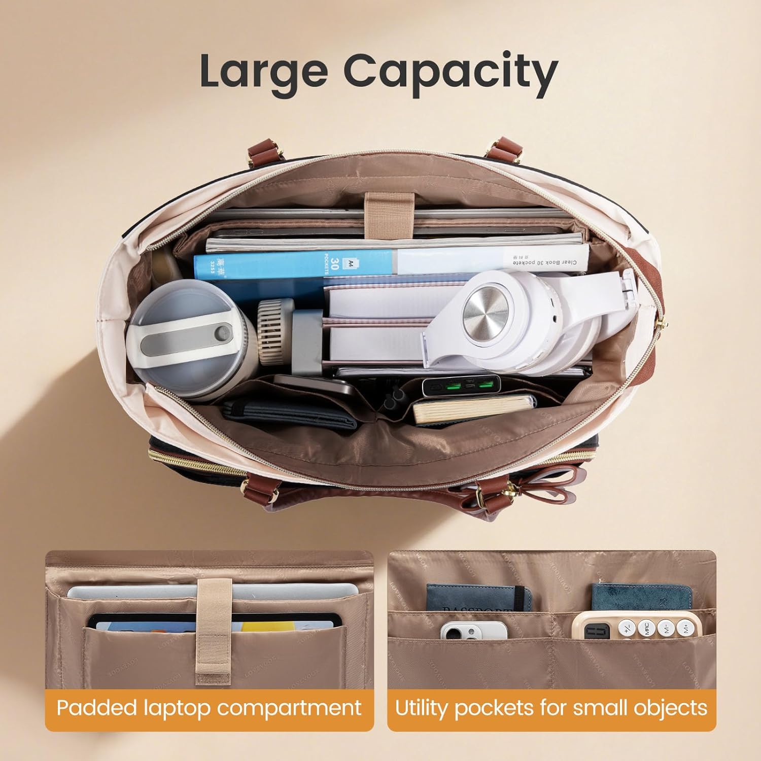 LOVEVOOK Teacher Tote Bag for Women, Work Laptop Bag Gift with Large Cup Holder, Quilted Nurse Bag Diaper Tote with Multi-Pockets, Large Computer Handbag Purse for Bussiness Travel, Office, College