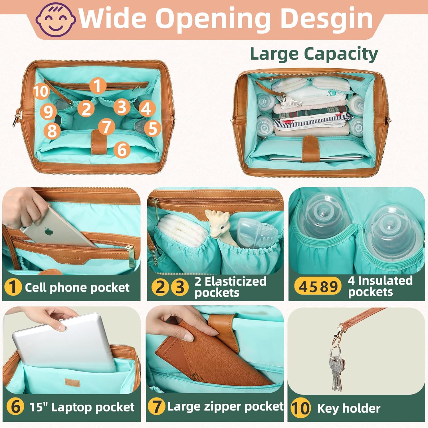 MOMINSIDE Diaper Bag Backpack, Baby Bag Leather with 16 Pockets, Large Baby Diaper bag for Mom, Fits 15 Inch Laptop, 4 Insulated Pockets, Changing Pad, Brown