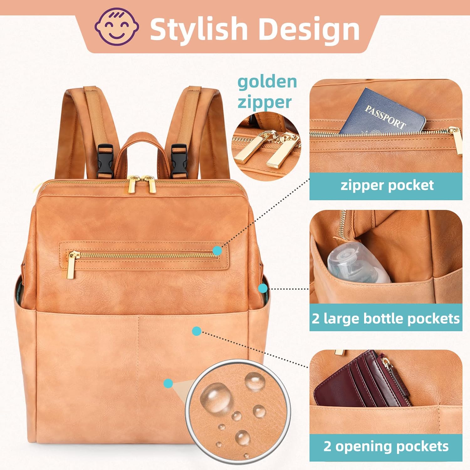 MOMINSIDE Diaper Bag Backpack, Baby Bag Leather with 16 Pockets, Large Baby Diaper bag for Mom, Fits 15 Inch Laptop, 4 Insulated Pockets, Changing Pad, Brown