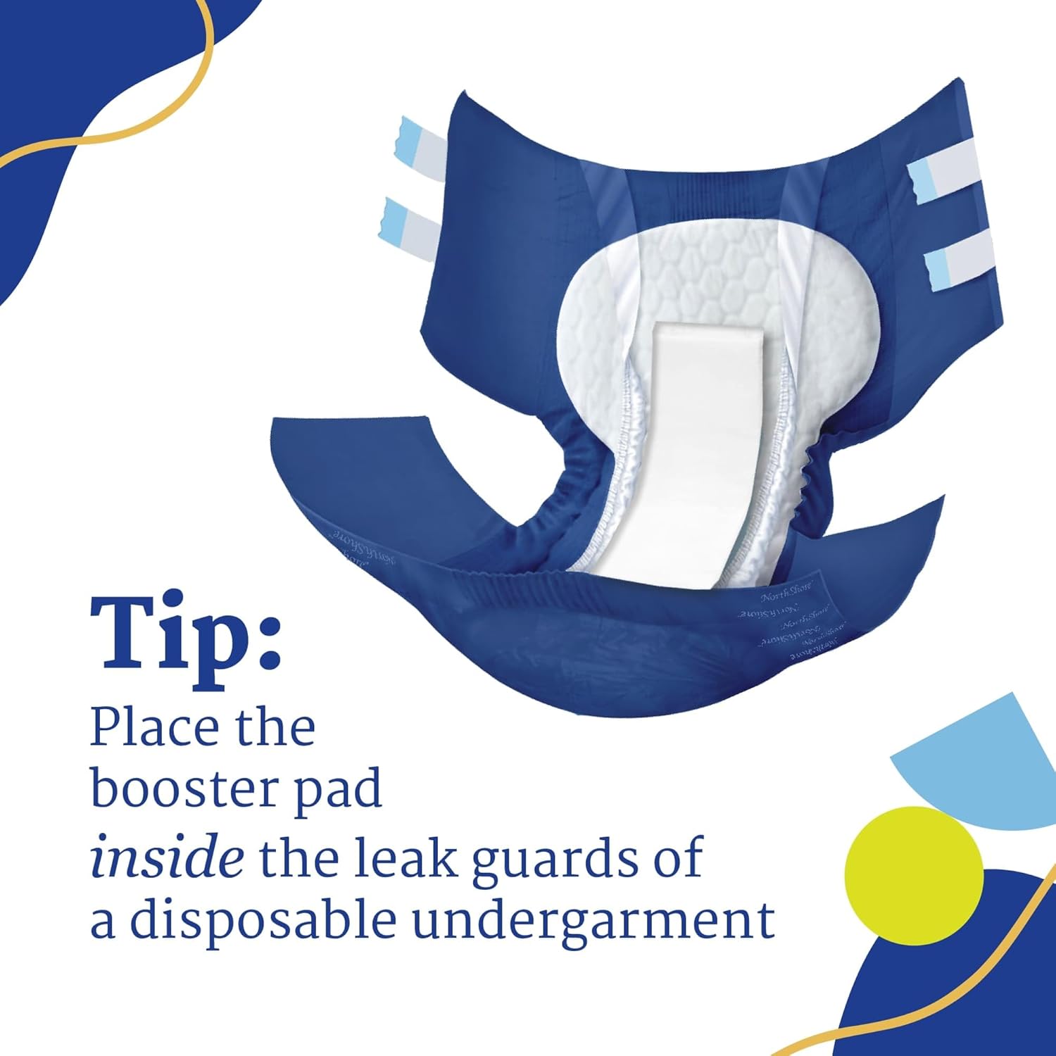 Place booster pad adhesive side down in center of diaper or where additional absorbency is needed. Boosters can be placed as far forward or back as necessary, as long as they are placed within leak guards.