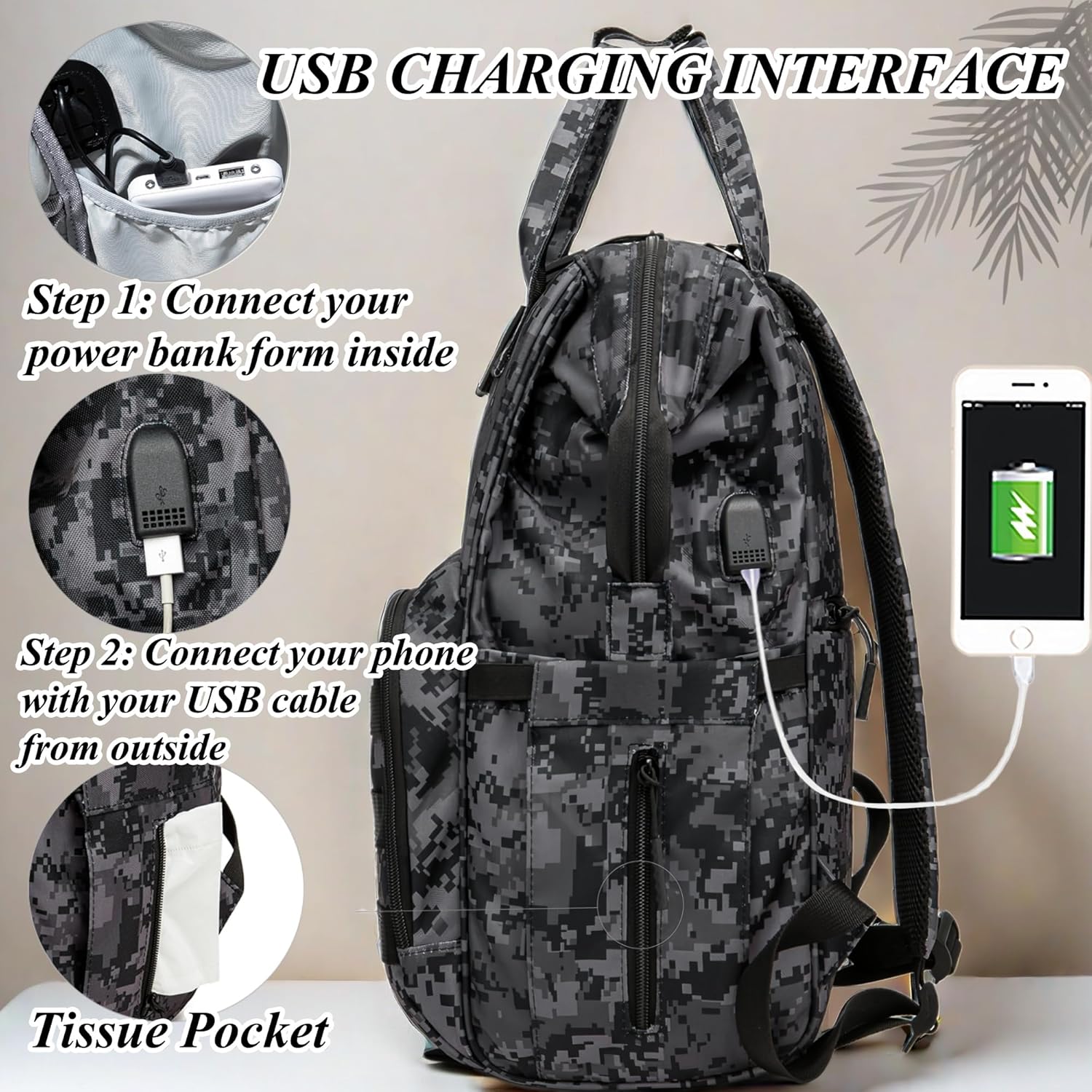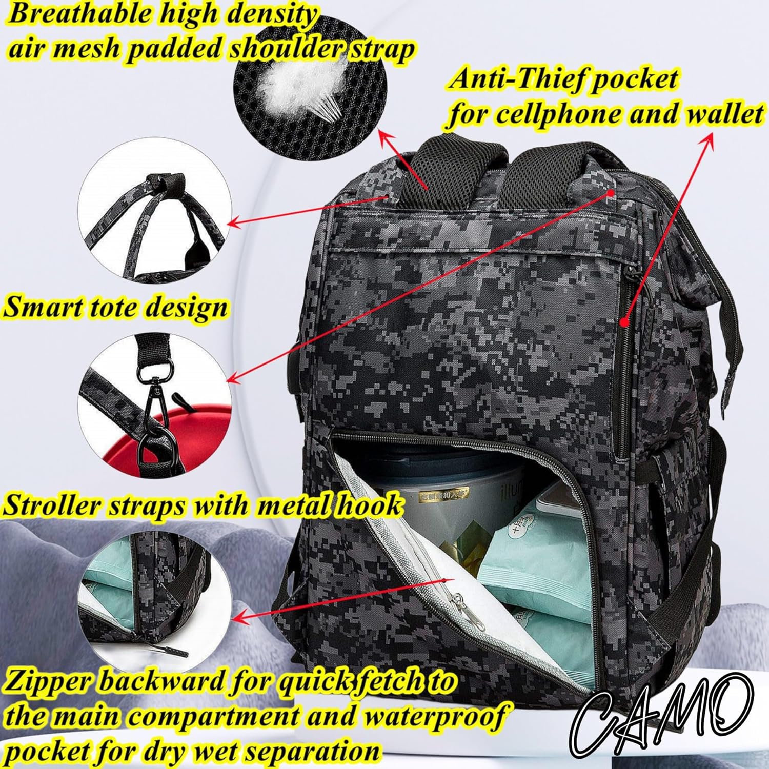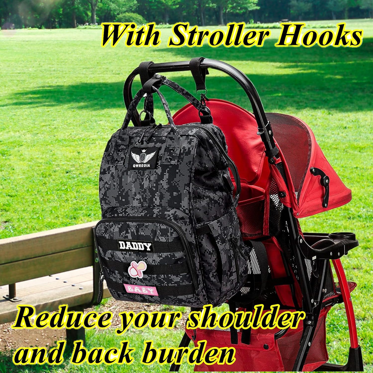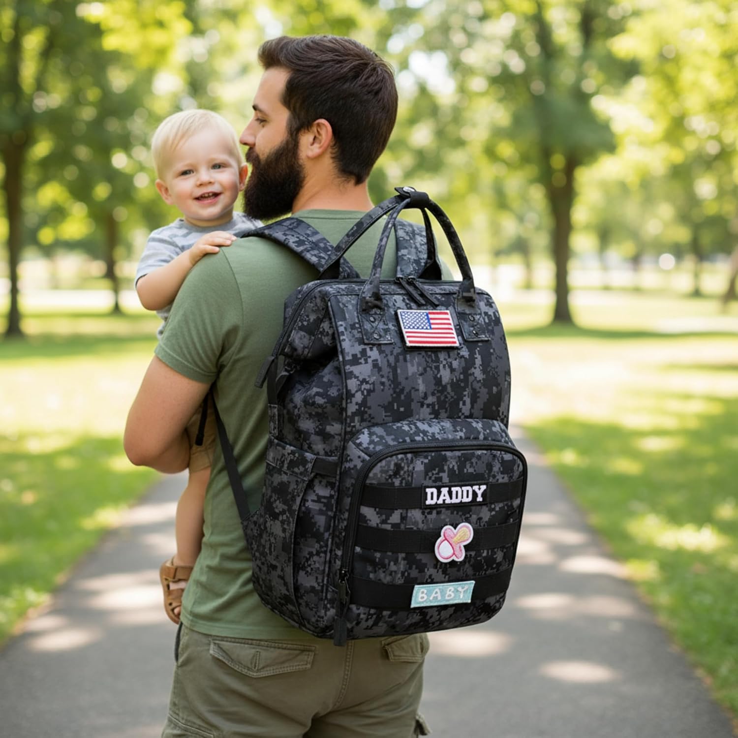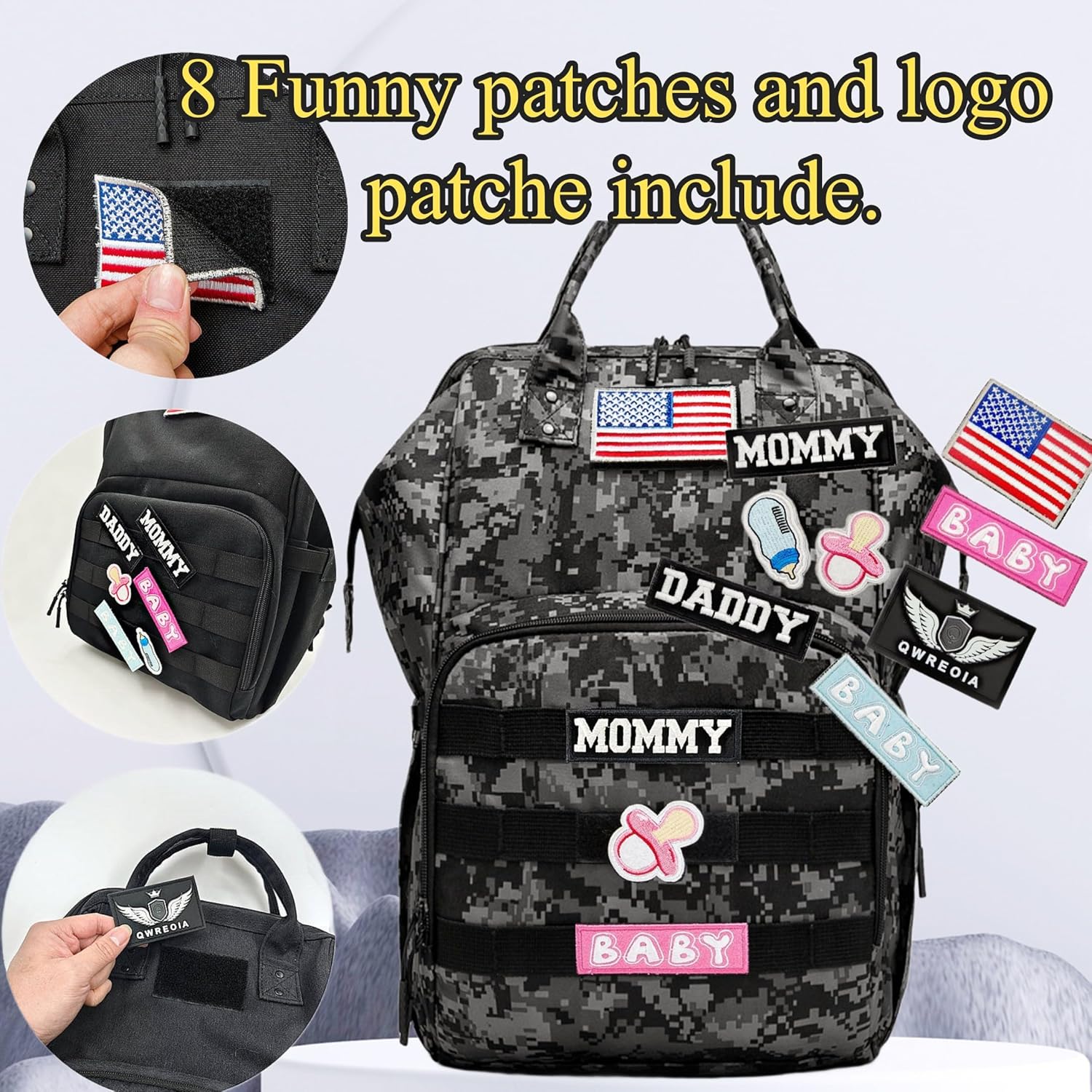 QWREOIA Camo Diaper Bag Backpack for Dad and Mom with USB Charging Port Stroller Straps and Insulated Pocket,army military Travel Nappy Backpack (DADDY and MOMMY patches)